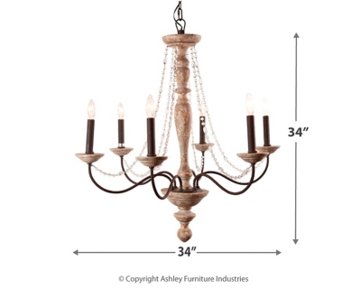 A decorative light that hangs from the ceiling and has several parts like branches for holding….
