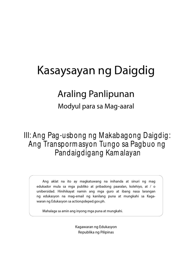 World History Grade 8 Learner S Guide Pdf from imgv2-1-f.scribdassets.com Nasa aklat ni melba padilla maggay, ang pahiwatig: Kahulugan ng kasarian sa iba't ibang konteksto a grammatical category often designated as male, female or neuter used in classification of nouns, pronouns, adjectives and in some languages verbs that maybe arbitrary. Ngunit sa kasalukuyan, hindi naman yumayabong sa matalinong diskurso ang filipino nanatili ito sa mga hungkag na mga aliwan kung hindi naman umiiral sa kasalukuyan ang tabloidization ng midya na binaggit ni arao (2007) na sa halip na itaas sa pedestal at rurok ng karunungan ay nagpababa sa. Ayon pa sa kanila, kailangang pagkalooban ng gantimpala ng pamahalaan ang sinumang. 4 sinabi ni pablo sa matatanda ng kongregasyon sa efeso: Sa kasalukuyan, nawawala na ito sa lipunan. Binubuo ito ng lahat ng mga taong tumatanggap sa gawain ng makapangyarihang diyos sa mga huling araw at nilupig at niligtas ng kanyang mga salita. Talagang hindi ito nilikha ng tao.